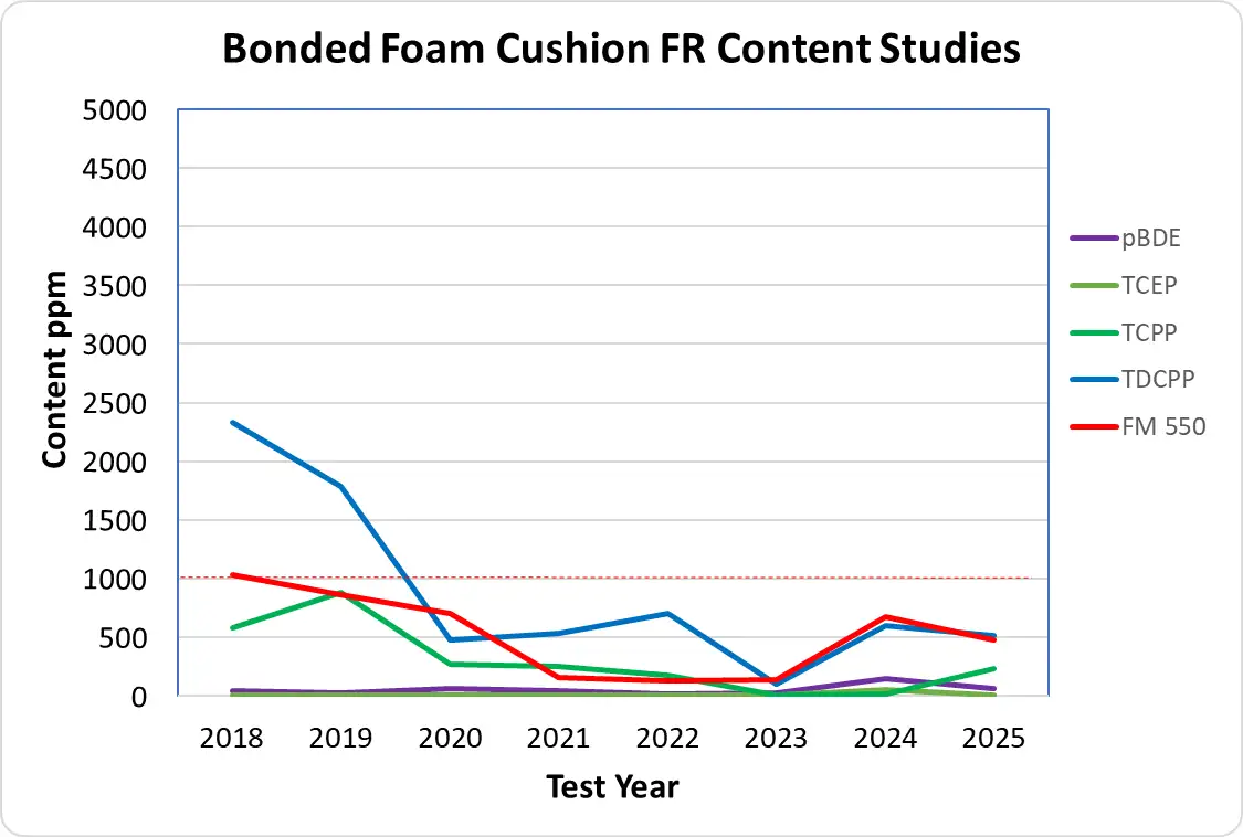 The CCC began monitoring TDCPP levels in new bonded cushion in 2014. Since then the concentration has declined significantly, as did PBDE.